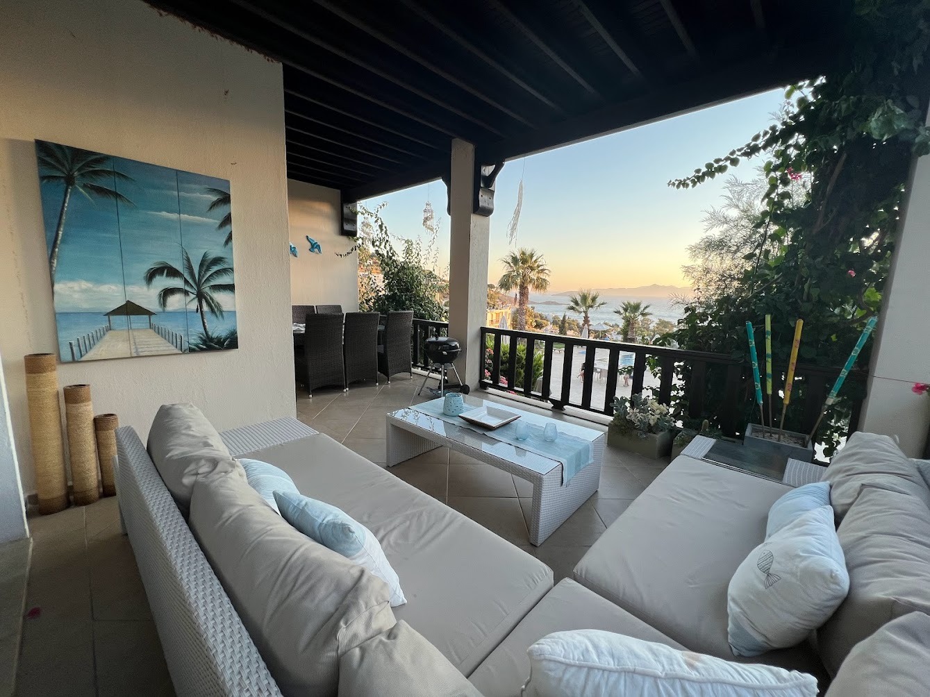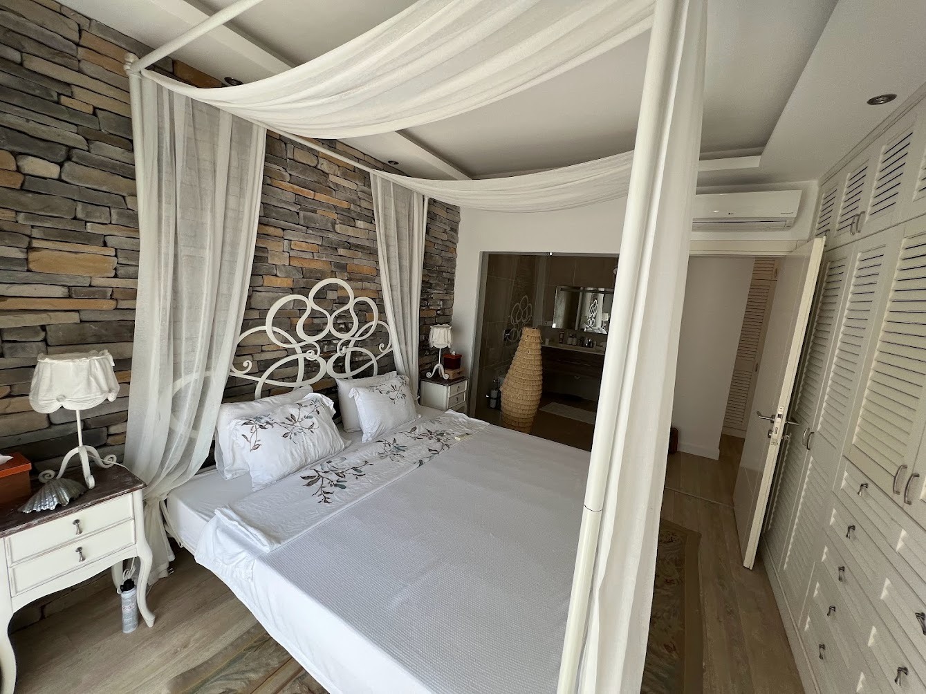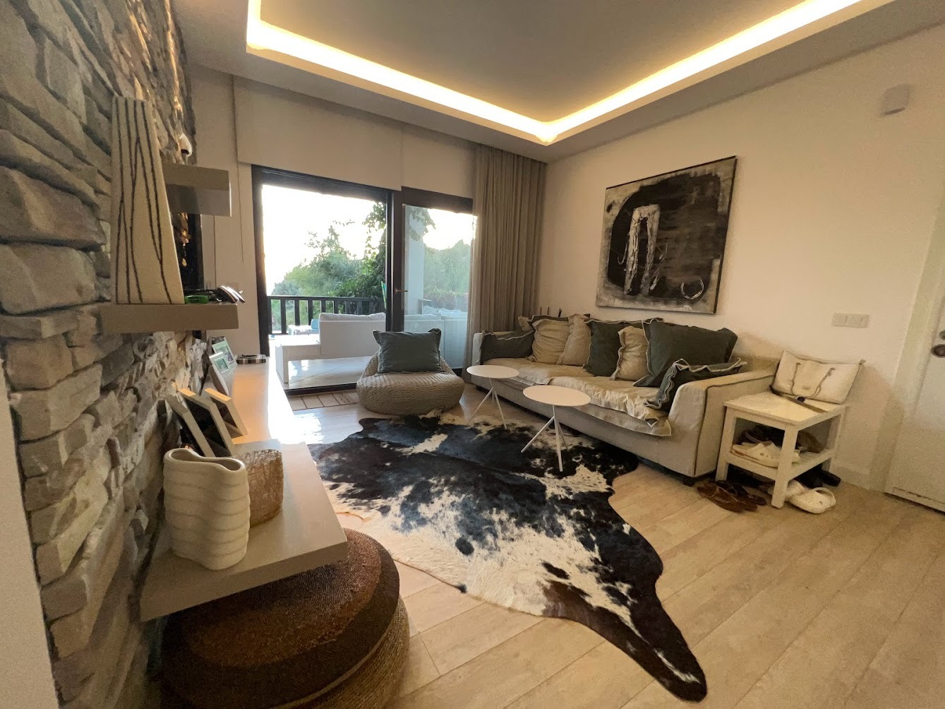 El diseño interior combina muebles de interior y exterior, revestimientos de paredes de piedra local, armarios de madera hechos a medida y suelos de alta calidad, creando un espacio de vida de concepto abierto que se integra perfectamente con la naturaleza. Se destacan los materiales naturales característicos de la región, buscando un estilo de vida moderno, práctico y elegante en armonía con la naturaleza. Esta vivienda está diseñada para atraer a profesionales, familias con niños pequeños o cualquier persona que desee pasar largas temporadas en Bodrum tanto en verano como en invierno.